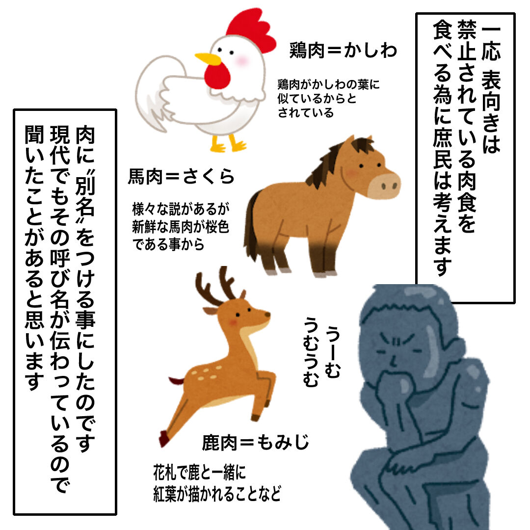 長年、肉食文化は日本では禁句だった為に、鳥獣の肉食は病人の養生や健康回復を目的として薬代わりに「薬食い」として食べるようにしたんですね。